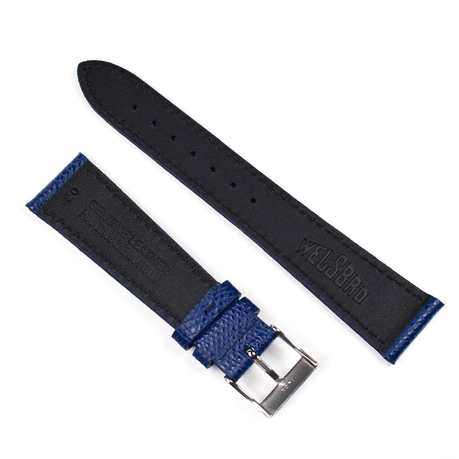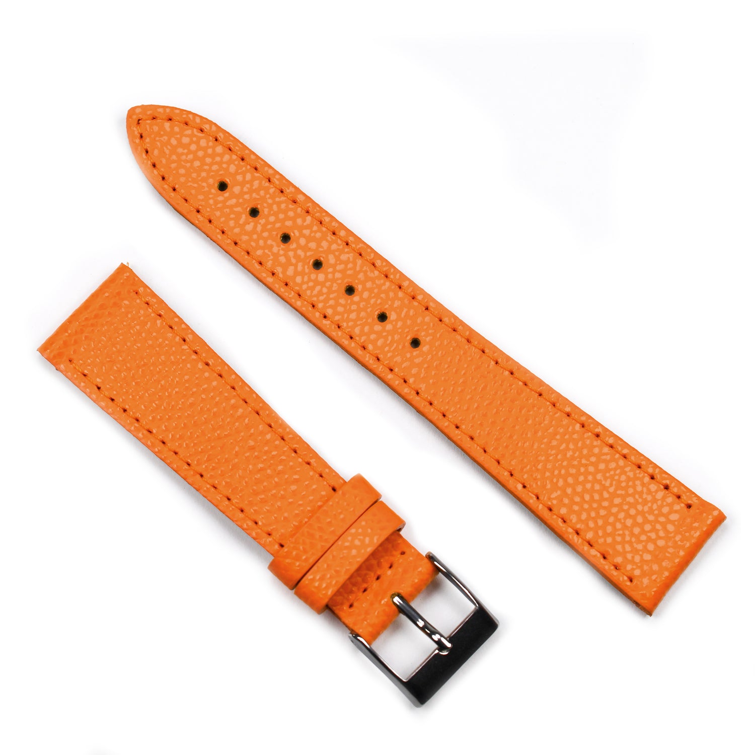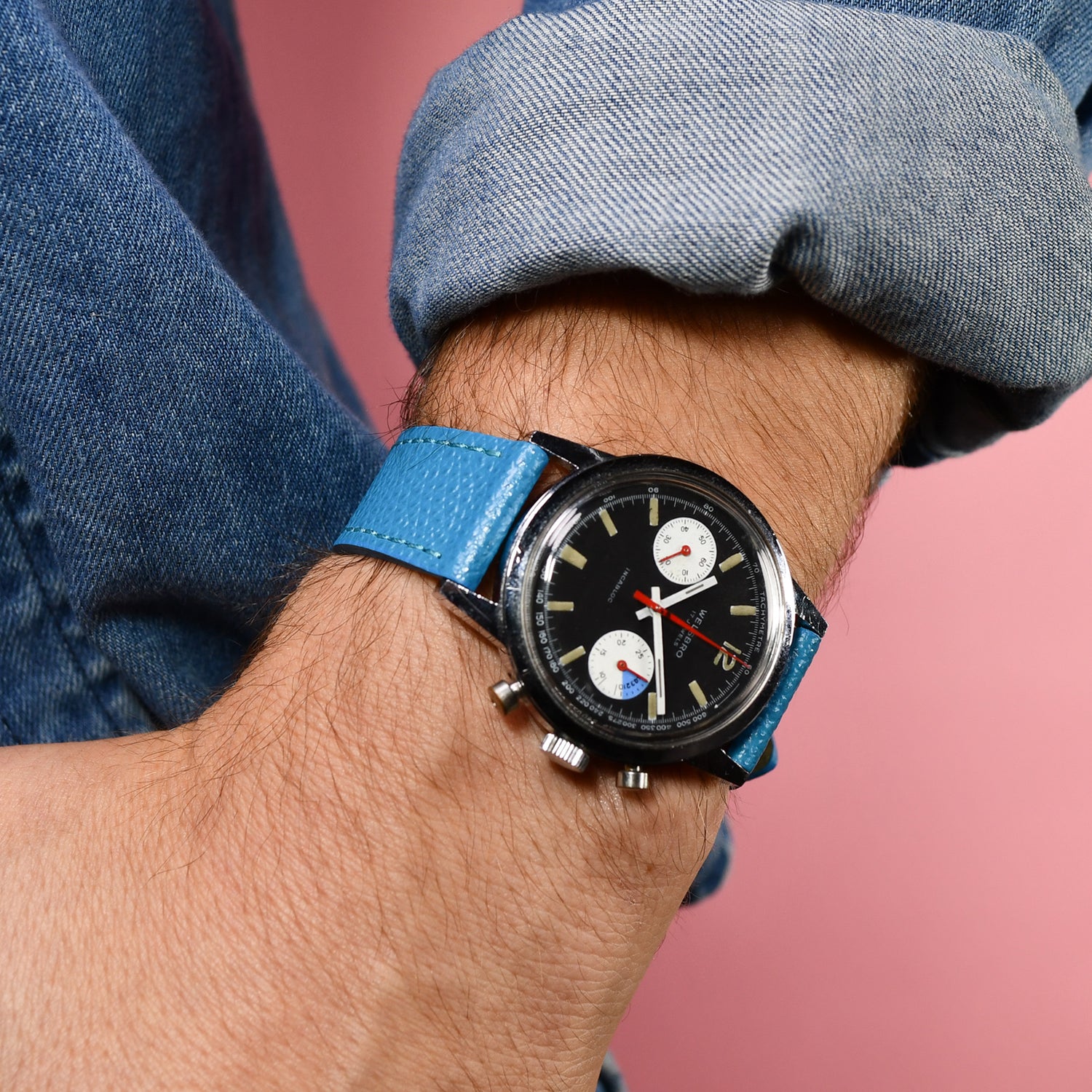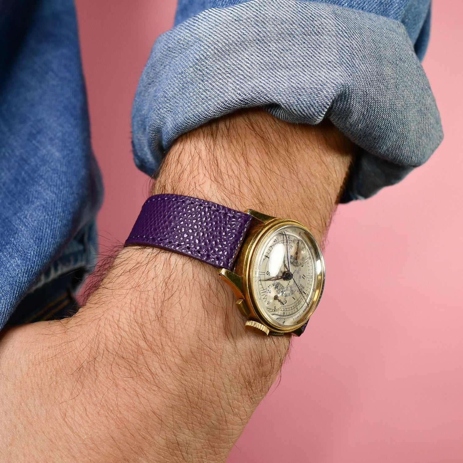 Our pebbled calfskin leather watch strap is water-resistant, durable, low-stretch and deeply rich in color. Lined with a breathable Nubuck leather, it wears comfy on the wrist. 100% handmade in Italy. Available in a rainbow of colors.
