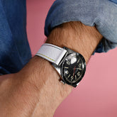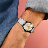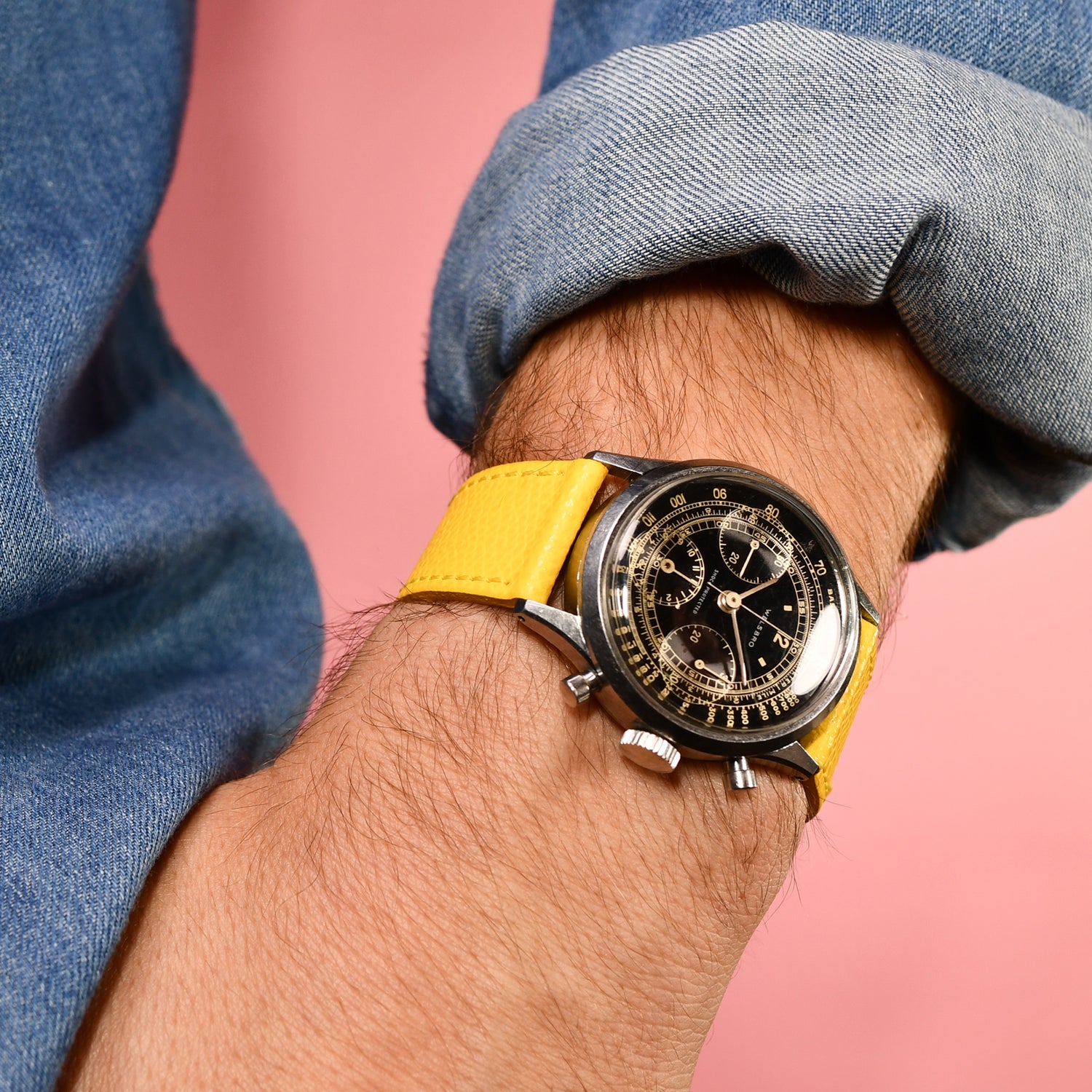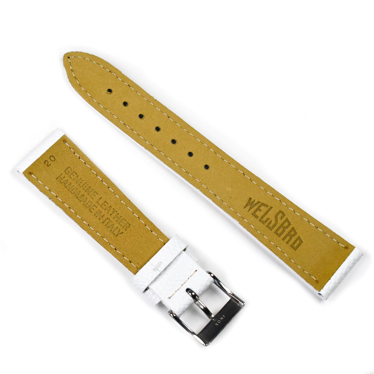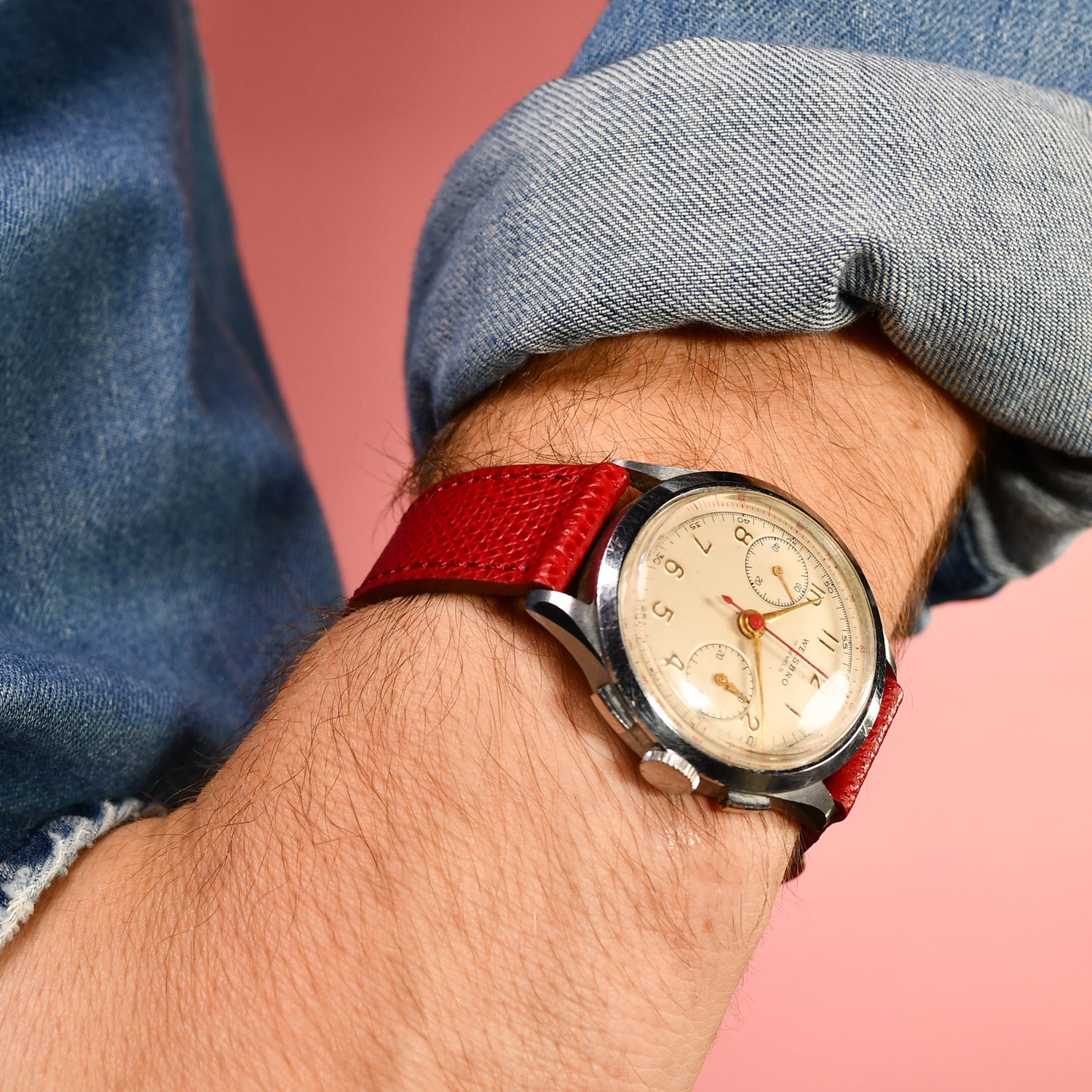 Our pebbled calfskin leather watch strap is water-resistant, durable, low-stretch and deeply rich in color. Lined with a breathable Nubuck leather, it wears comfy on the wrist. 100% handmade in Italy. Available in a rainbow of colors.