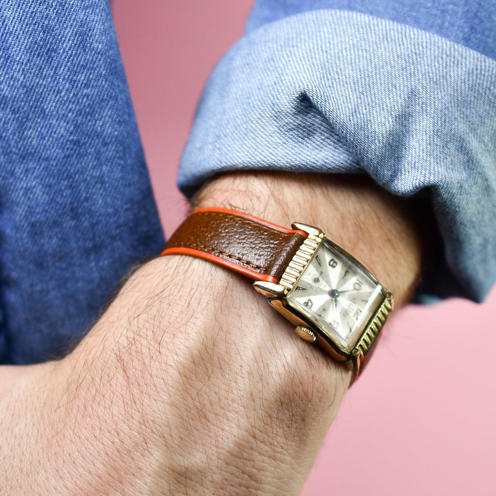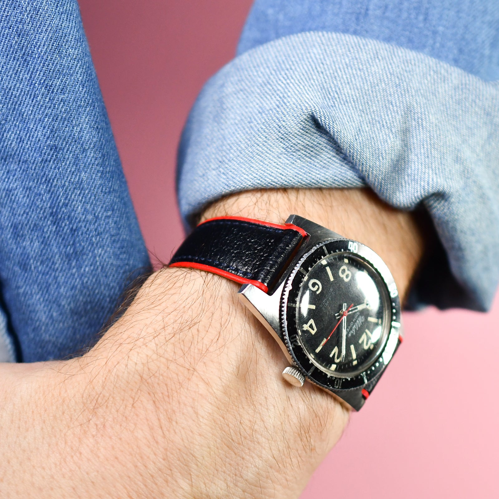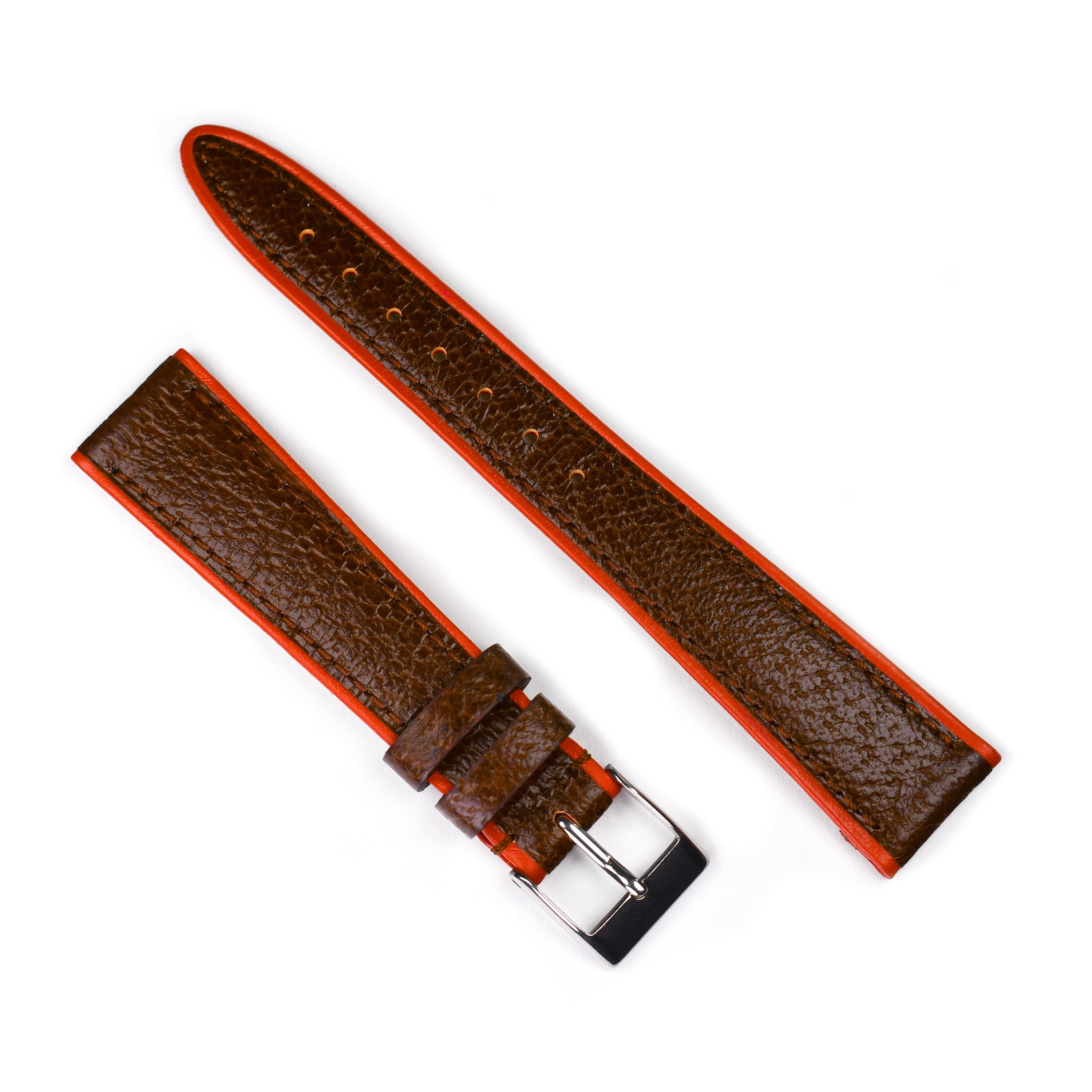 The wild boar leather watch strap is a vintage-inspired beauty. The durable leather has a ton of character. The construction is special; the  dramatic slim taper gives it a vintage look while the neatly rolled edges showcase a pop of color. The strap elevates any watch. 100% handmade in Italy.