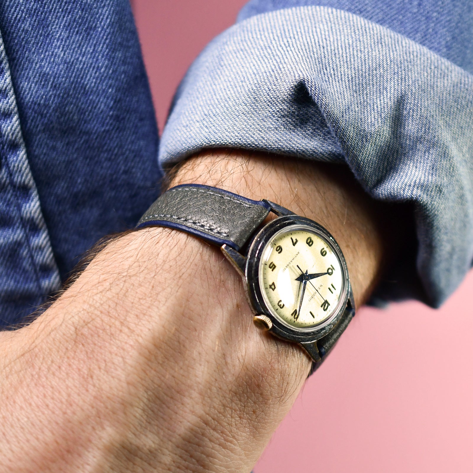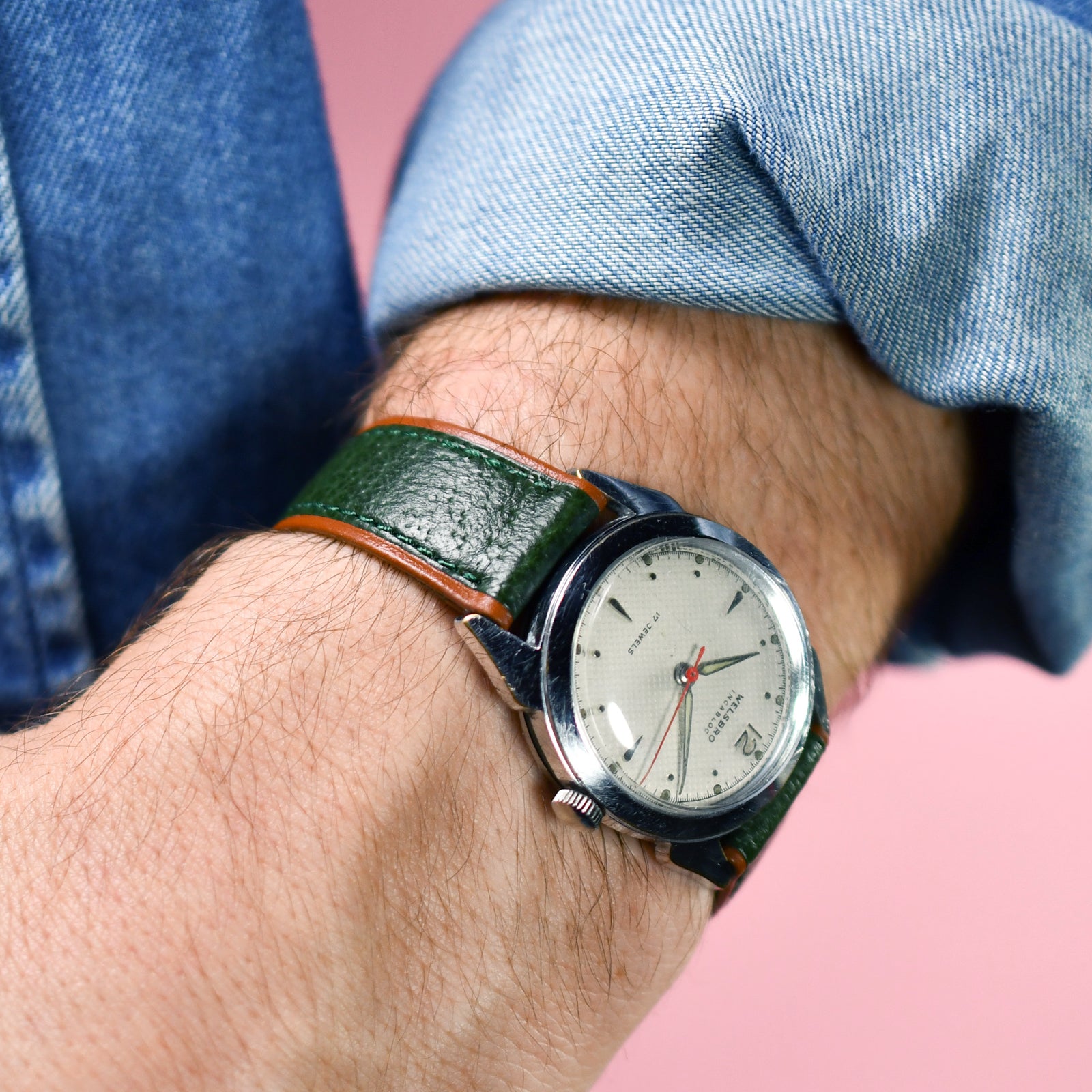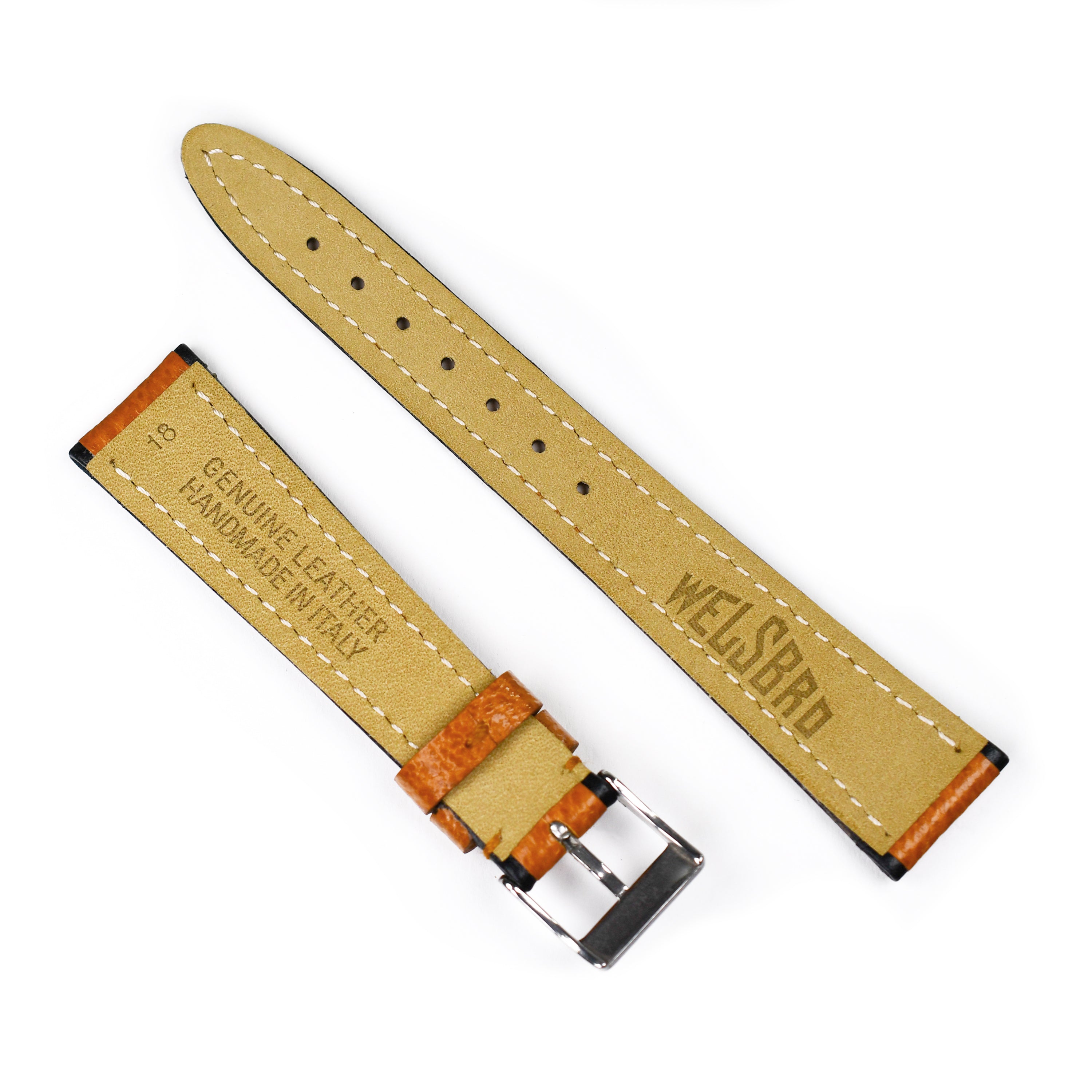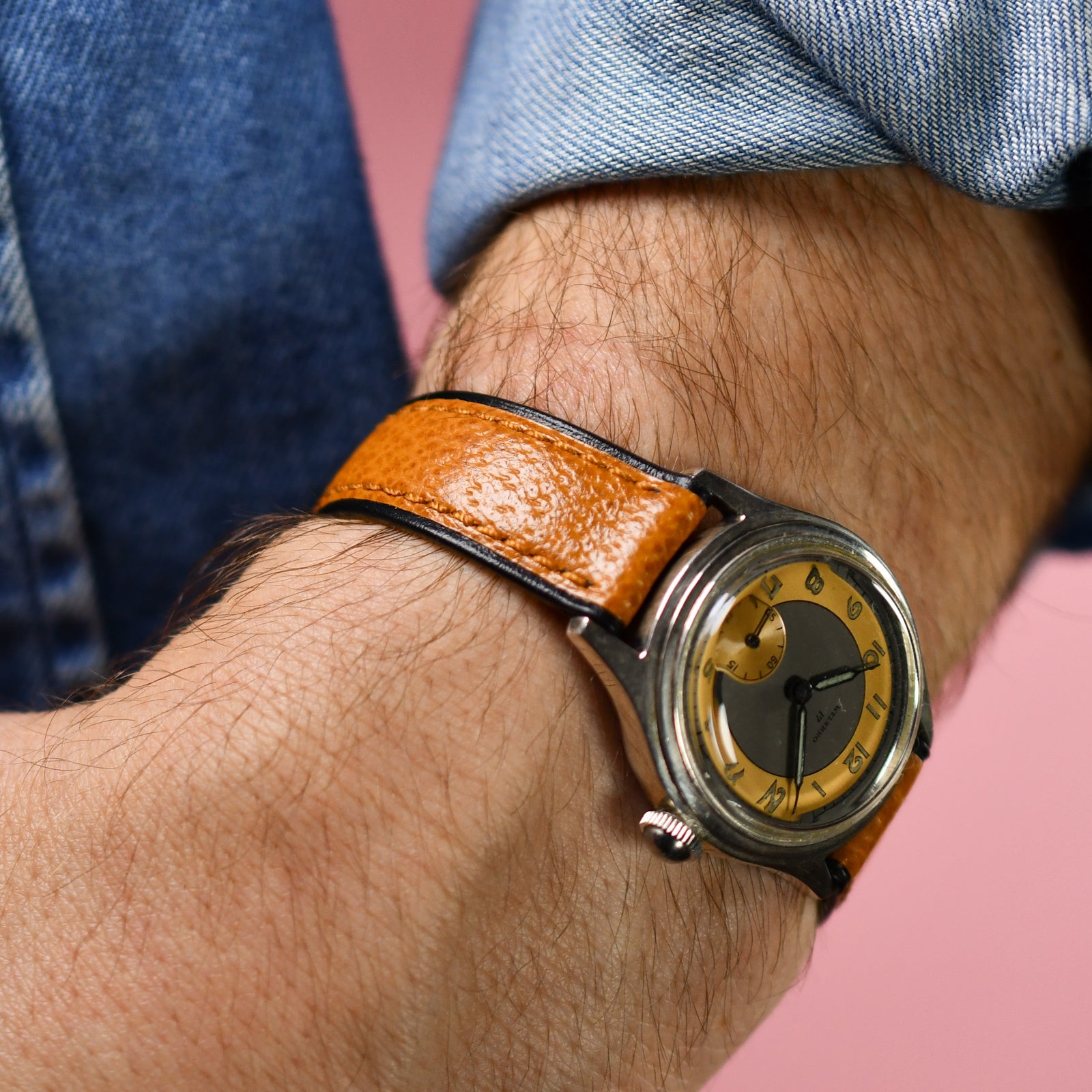The wild boar leather watch strap is a vintage-inspired beauty. The durable leather has a ton of character. The construction is special; the  dramatic slim taper gives it a vintage look while the neatly rolled edges showcase a pop of color. The strap elevates any watch. 100% handmade in Italy.